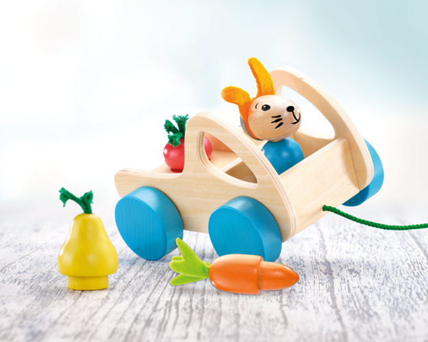 Charger les fruits et légumes et c’est parti. Le petit lapin fonce joyeusement à travers la chambre d’enfant avec sa voiture à légumes. Le rangement des éléments enfichables multicolores favorise de façon ludique l’identification et l’attribution de couleurs.